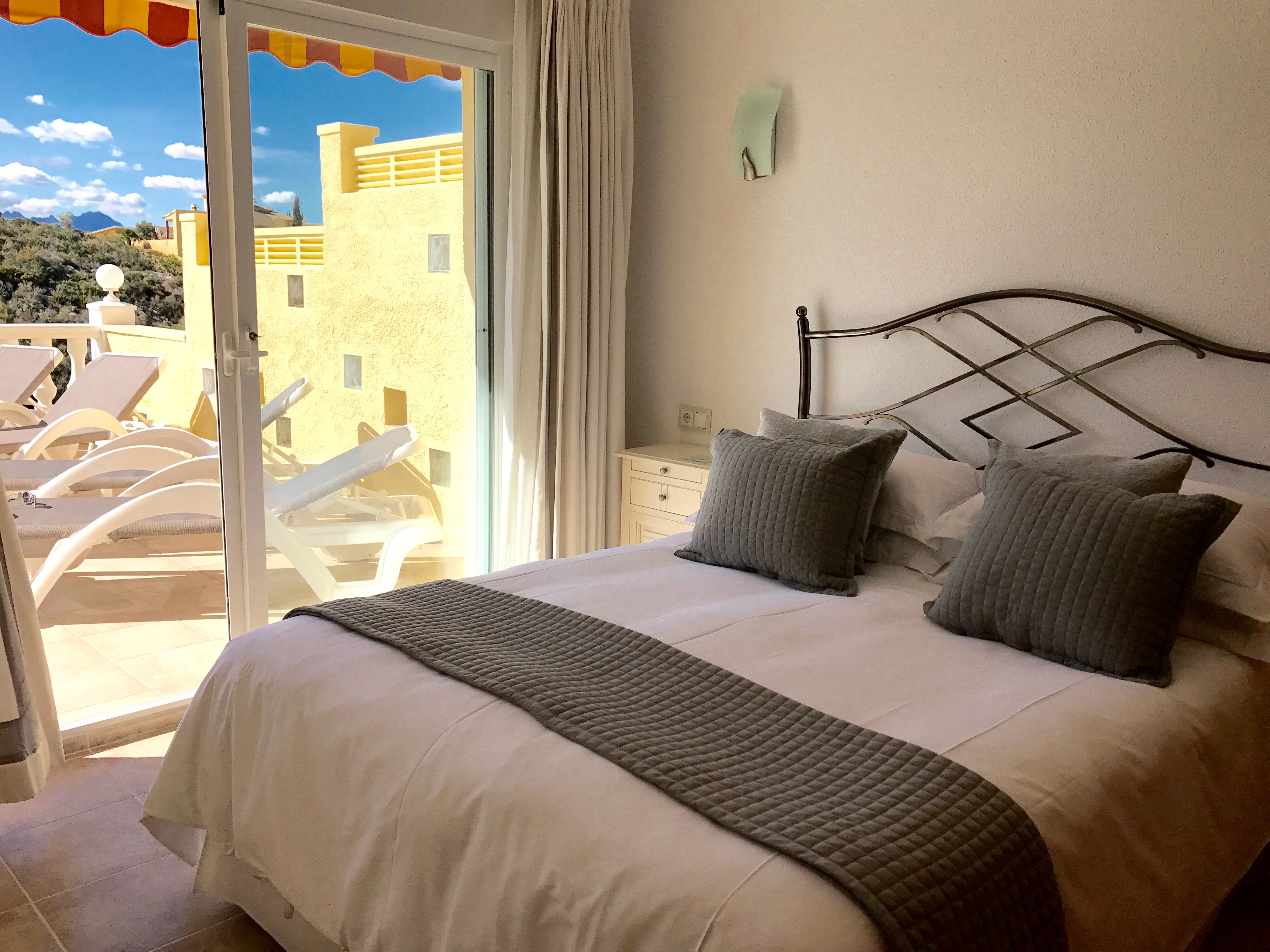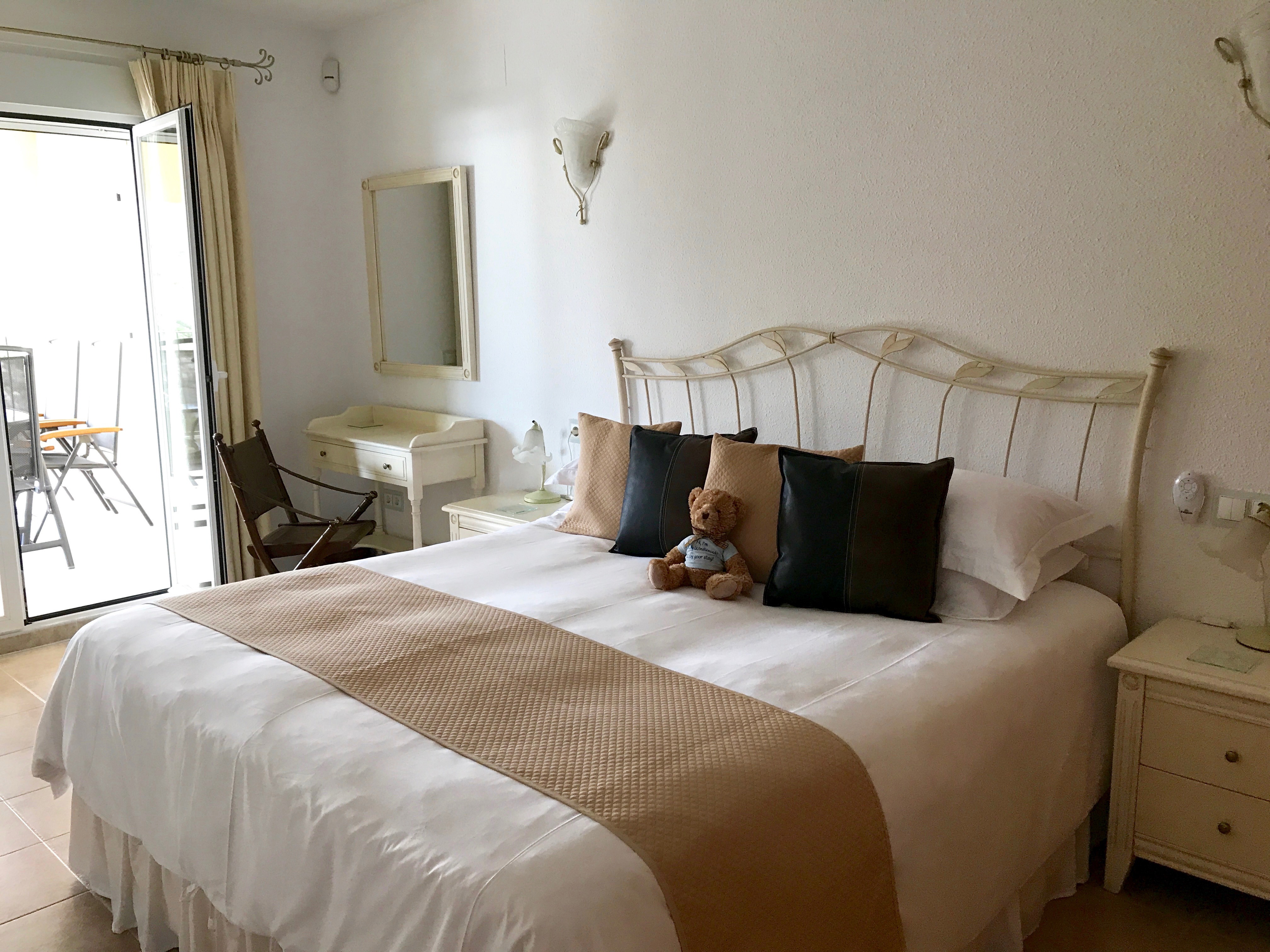 Master bedroom – Spacious bedroom with brand new in 2025 over-sized Super King bed (6ft x 6ft6), dressing table, and luxury bathroom ensuite with double vanity units and feature glass-walled walk-in high power shower. Patio doors lead out to the upper terrace.